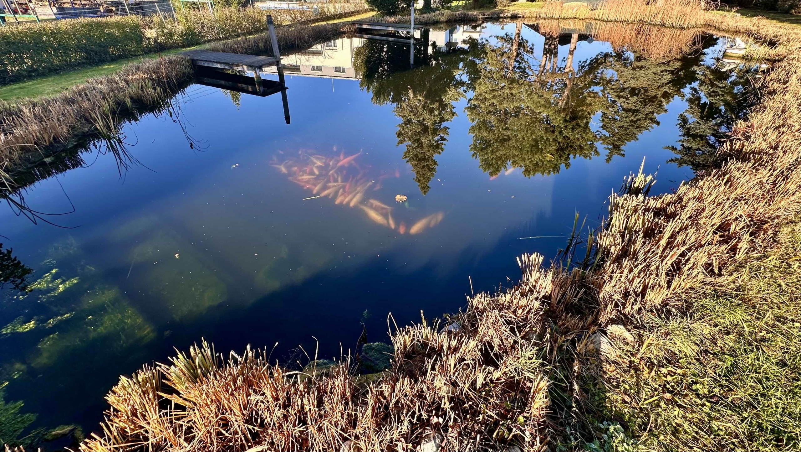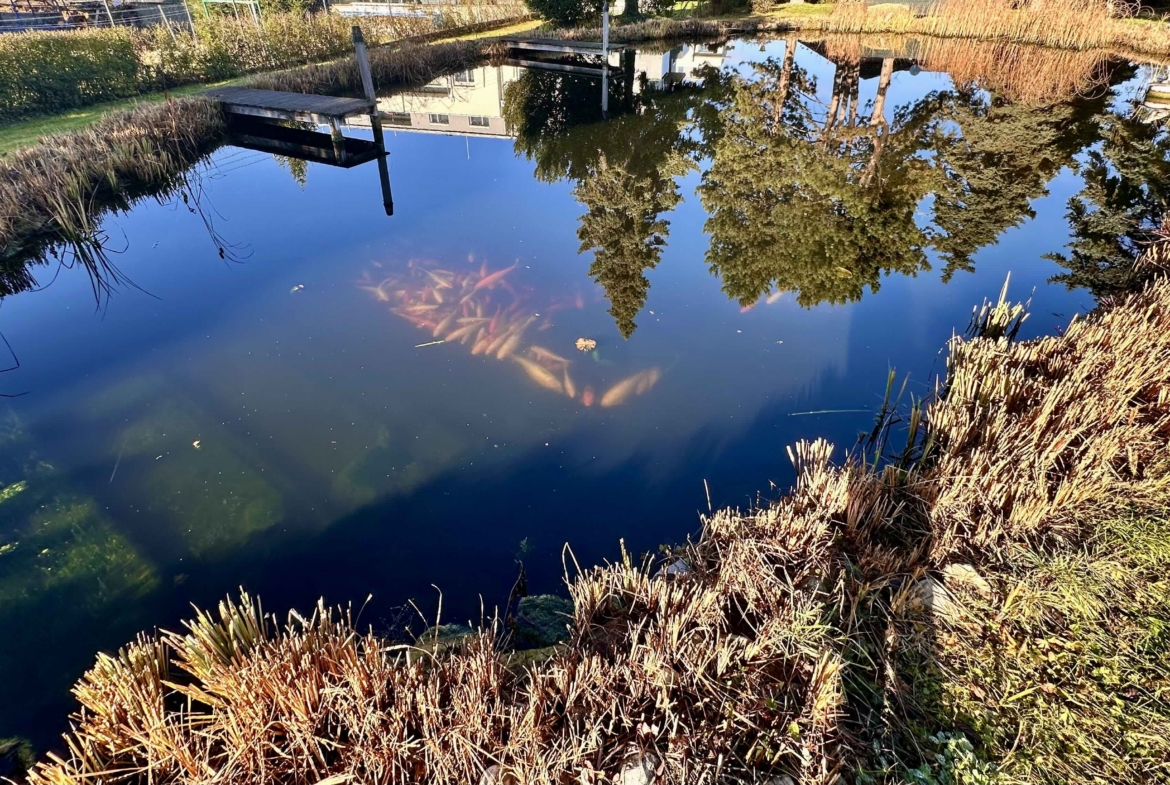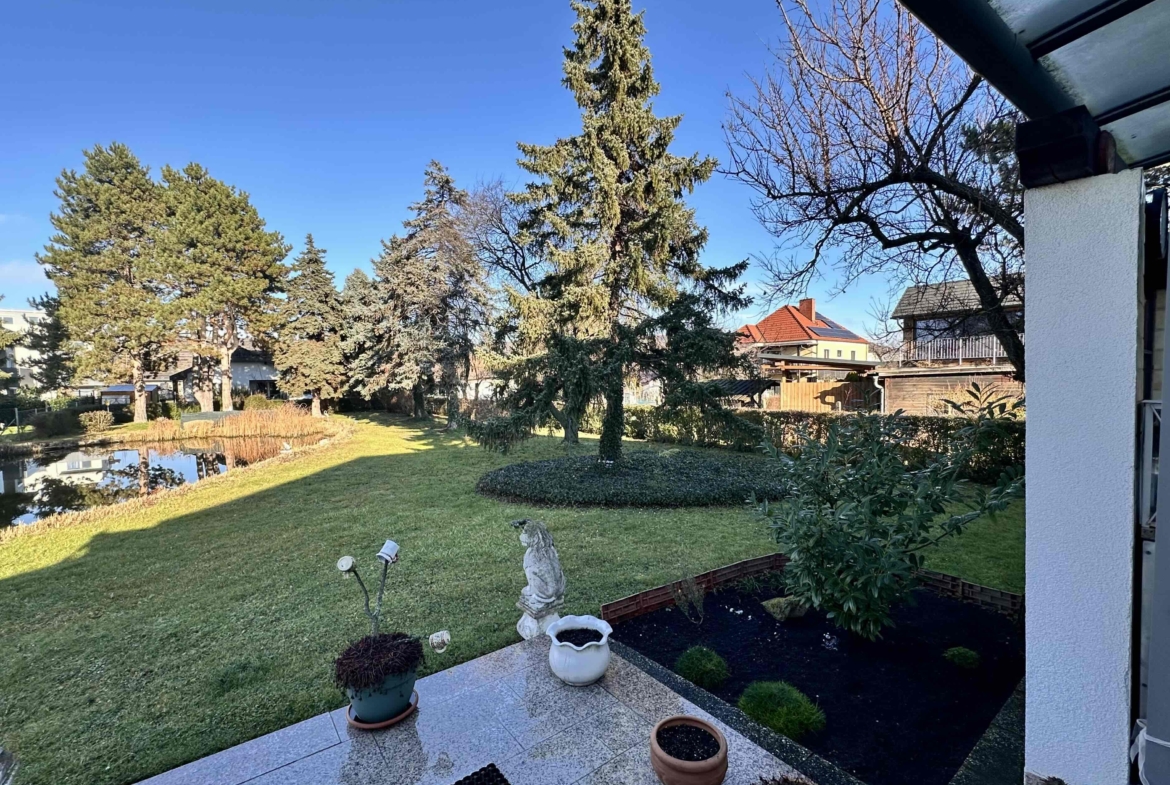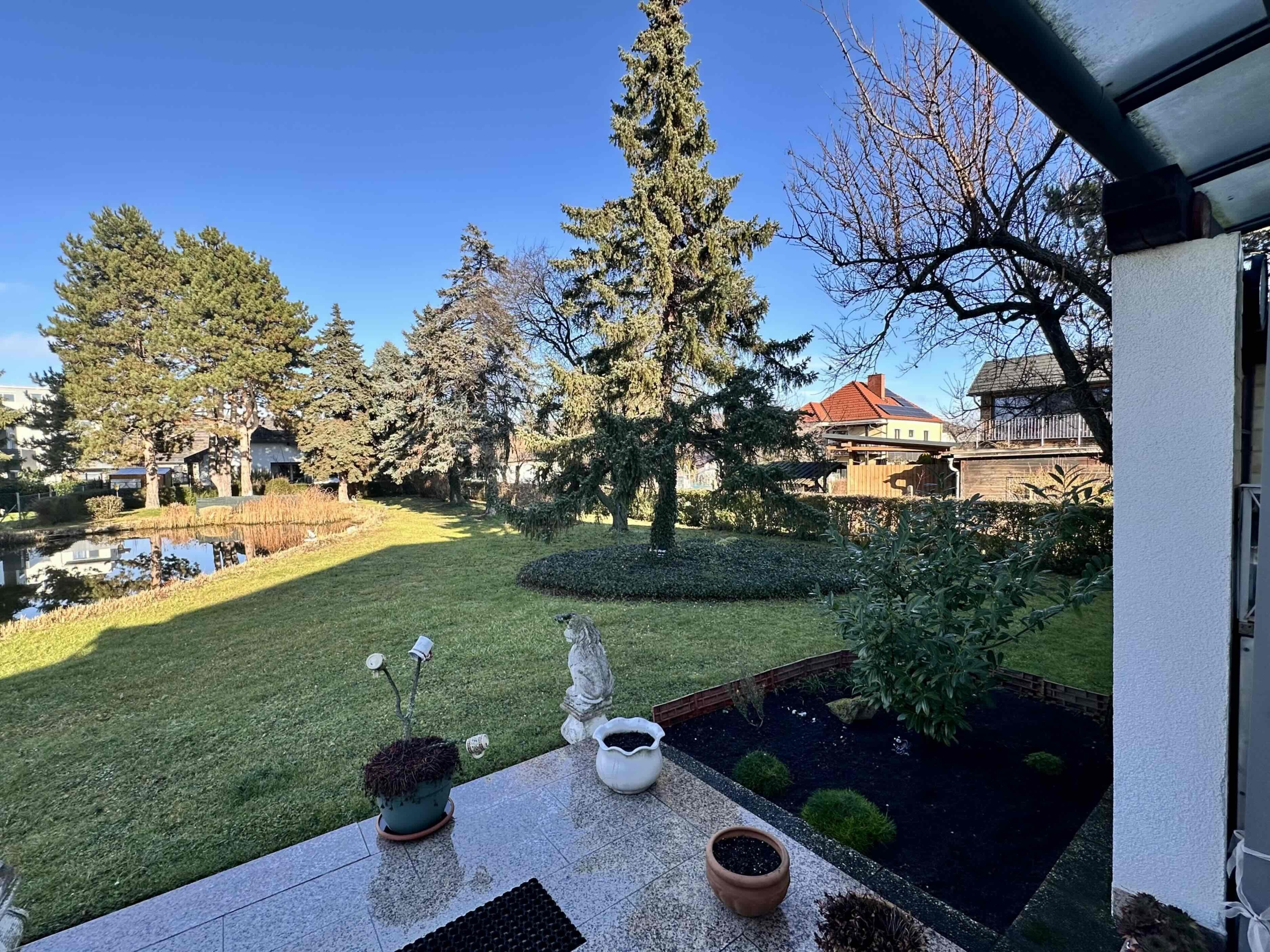 Der liebevoll angelegte Garten mit Schwimmteich, Altbaumbestand und Terrassenbereich schafft eine ruhige, private Wohlfühloase.